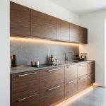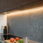 Главная особенность этой модели — продуманные световые сценарии. В отличие от стандартных решений, здесь интегрирована скрытая контурная LED-подсветка не только рабочей зоны, но и цоколя, создающая эффект «парящей» кухни. Это дизайнерское решение добавляет воздуха и магии в вечернее время, превращая обычный гарнитур в арт-объект. Строгие стальные ручки подчеркивают геометрию фасадов, не перегружая общий вид излишним декором.